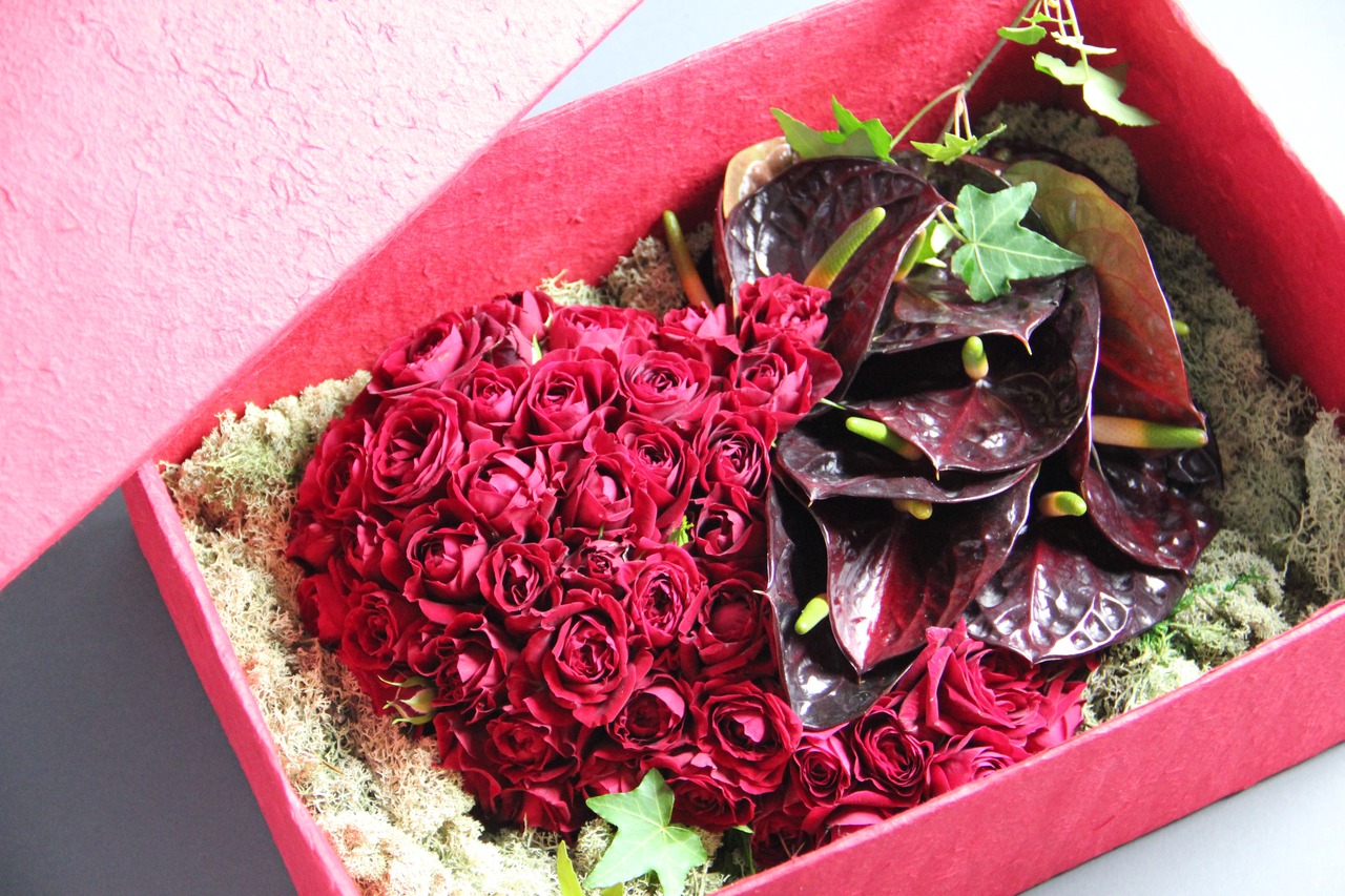 フランス・パリでは定番なハート型のアレンジメントをボックスに入れました。